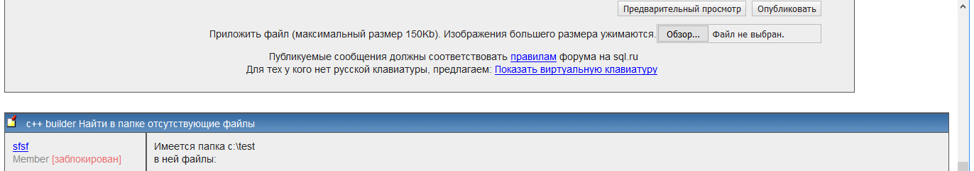 Топик https://www.sql.ru/forum/1241447/c-builder-nayti-v-papke-otsutstvuushhie-fayly У ТС написано Member [скрыт] Как понимаю скрыл что-то там галочкой в профиле. Нажимаю "ответить" и вижу там же Member [заблокирован] ... |