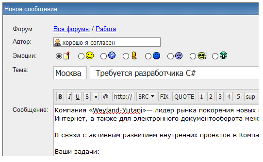 Очень неудобно искать сотрудников и вакансии. Я в Ворожене ищу, а в списке намешаны все - и Москва, и Хабаровск. Почему бы в теме не писать: Цитата [Хабаровск] Программист Java Цитата [Удалённо] Оператор БД MS SQL Server Цитата Киев. Офисный рограммист VBA+Excel Цитата Удалённо. Оператор БД MS SQL Server Для этого либо правило на форуме ввести, чтобы все ему следовали (врядли толпу так легко приучить сразу), либо, ещё круче, специально для форума "работа" в интерфейс создания нового поста добавить поле "Город", текст из которого будет просто конкатенироваться к началу заголовка при нажатии на кнопку "Опубликовать". ... |