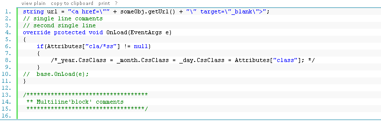 judge Постараюсь. Я уже делал несколько подходов - но пока безуспешно. Видимо без полноценного детерменированного автомата тут не обойтись. //http://www.dreamprojections.com/SyntaxHighlighter/ Примеры: - C# //http://www.dreamprojections.com/SyntaxHighlighter/Tests/CSharp.html - Java //http://www.dreamprojections.com/SyntaxHighlighter/Tests/Java.html - SQL //http://www.dreamprojections.com/SyntaxHighlighter/Tests/SQL.html ... |