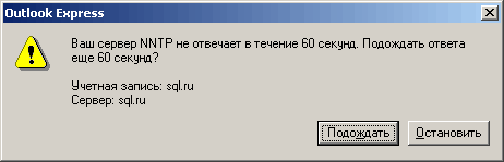 Проблема есть и у меня. Configuration: Account: sql.ru Server: sql.ru User name: thkd Protocol: NNTP Port: 119 Secure(SSL): 0 Code: 800ccc0f WinXP SP1 OE 6.00.2800.1106 ... |