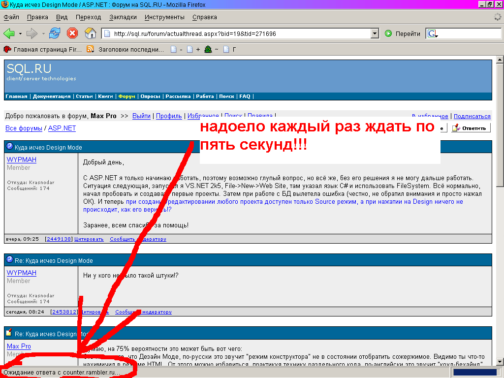 judge, ты обычно прислушиваешься к дельным советам. Поэтому сайт постоянно улучшается. Последнее время стало злить зависание загрузки каждой страницы на несколько секунд. В результате анализа, выяснилось, что мешает rambler (см. влож. рисунок). Если этот рамблер убрать к чёртовой матери, сразу все вздохнут с облегчением. С уважением, Max Pro ... |