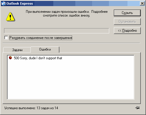 //Программизд, ты в своих прогах, отдаваемых заказчику, //допускаешь подобное обращение? У нас отдел QA за тексты отвечает. PS Например у сервера GMX такое сообщение I'm afraid I wasn't able to deliver your message to the following addresses. This is a permanent error; I've given up. Sorry it didn't work out. тоже с юморком, и ничего, все нормально. ... |
