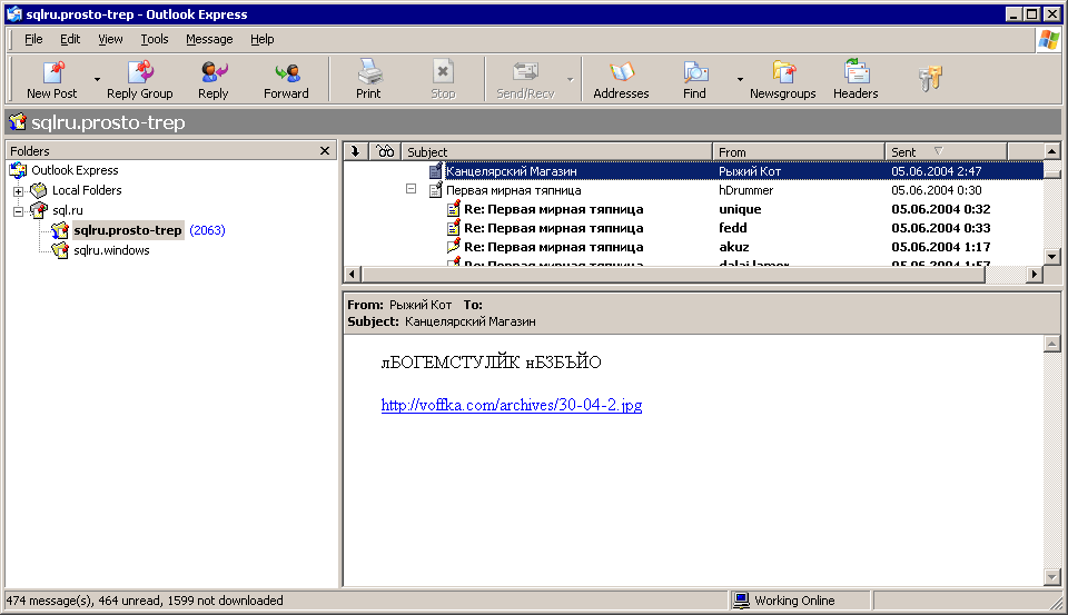 После трудового дня обычно в форуме MS SQL сотни непрочтенных мной сообщений. Почему-то после первого открытия NNTP находит несколько сотен непрочтенных сообщений, но это не все сообщения. Я делаю в tools->Get Next 300 Headers и появляются новые сообщения. И повторяю это до тех пор, пока все сообщения не станут видимы. Или не становятся видимы очень старые сообщения. Judge сделал так, чтобы ответы на вопросы в NNTP располагались после вопросов. Но структура форума на HTTP другая, плоская и это запутывает, иногда ответы из конца обсуждения улетают в начало. ... |