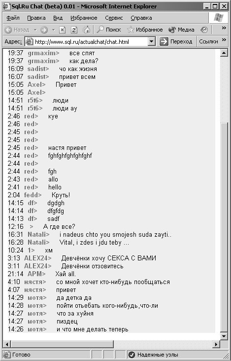 автор 3:13 ALEX24> Девчёнки хочу СЕКСА С ВАМИ 3:11 ALEX24> Девчёнки отзовитесь 21:14 APM> Хай all. 4:10 нястя> со мной хочет кто-нибудь пообщаться 4:07 нястя> привет 14:29 мотя> да детка да 14:28 мотя> пойти отьебать кого-нибудь,что-ли 14:27 мотя> что за х..ня 14:27 мотя> п....ц 14:26 мотя> и что мне делать теперь ... |