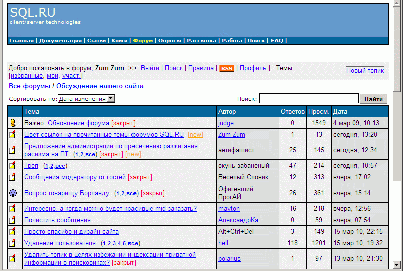 Zum-Zum>отличать темы, уже посещённые, от ещё не посещённых, независимо Zum-Zum>от того, была ли обновлена страница темы на сервере В принципе, NNTP эту проблему решает. Posted via ActualForum NNTP Server 1.4 ... |