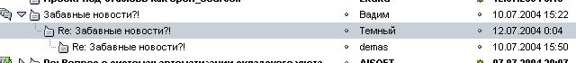Добрый день ! А кто-нибудь читает sql.ru с помощью mozilla ? Игрался с настройками, но почему-то неудается заставить отображать дерево сообщений в нужном порядке. Например, иногда сообщение которое было написано позже, отображается выше, чем то, которое раньше. Я приложил небольшой рисунок, демонстрирующий это. Настройки - > Sort by Date / Threaded / Descending ... |
