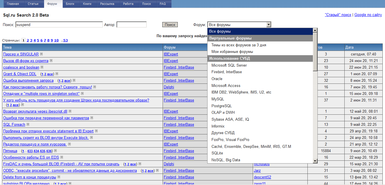 AltHasp 11.07.2020, 12:50 Где? Не вижу. да и быстрый поиск в подфорумах сломан. Пока judge будет это чинить, поступайте так - выбираете в главном меню "Поиск" - справа в комбобоксе "искать в форуме" выбираете "IBExpert" (там он присутствует) - ищете в подфоруме. ... |