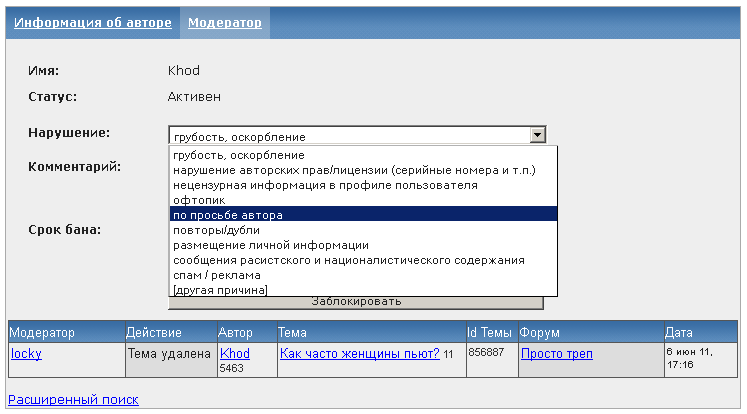 Khod в профиле рядом с "заблокирован" указывать имя модератора ... |