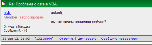 alвк Гаджимурадов Рустам если после бана полез ещё и возмущаться Что касается самого бана, то он стандартный "бан по расписанию", т.е. в ноябре будет тоже самое. Не думаю, что что-то может помешать Гео забанить меня точно также и в будущем, по той же схеме: 1.Удаляем моё сообщение. 2.Баним мой ник на несколько дней за удалённое сообщение. Поскольку сообщение удалено, то можно сказать, что я там написал что угодно, а каждая моя последующая реакция может трактоваться, как попытка себя оправдать, не более. 3.При любой фразе с моей стороны (хоть про погоду) - баним мой ник навечно. Бессмысленно искать причины, логику бана и т.д. Бессмысленно обижаться на модератора. Ты либо принимаешь данность, либо нет и уходишь на другой ресурс. Единственное, что ты можешь легально сделать (на мой взгляд) как рядовой участник форума - инициировать вопрос о перевыборах модератора. ... |