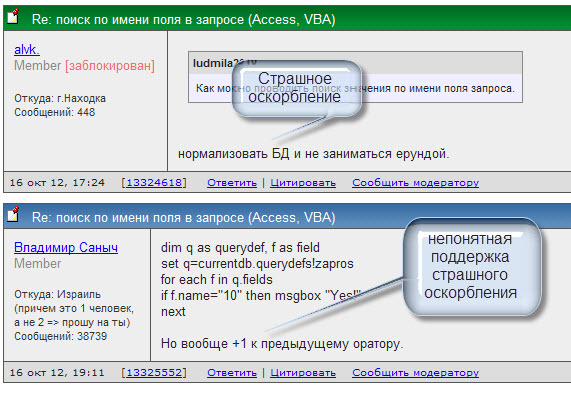 alвк, Спорить с пеной у рта вы можете хоть до завтра, ничего это не изменит. И они останутся при своём мнении, и Вы будет считать, что вы самый белый и пушистый. Есть такие штуки как мнение, впечатление, реноме, репутация - подмочить её куда проще и быстрее, чем заработать или тем более восстановить. Так вот - если Вы действительно хотите нормального к себе отношения - попробуйте таки быть самым белым и пушистым, в т.ч. для ТСов, которым вы пишете про ерунду и "no comments" - перейдите в режим Анатолия из Киева (или кто у вас там образец для подражания?), в т.ч. не пишите "то что всем можно" и т.д. Поживёте несколько месяцев или полгодика в режиме "от меня только польза" - авось и отношение всех поменяется, в т.ч. модераторов и недоброжелателей. Posted via ActualForum NNTP Server 1.5 ... |