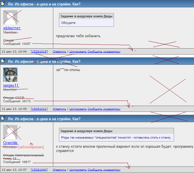 Возможно, было бы лучше, если бы заголовок всегда оставался на виду, а форум под ним прокручивался бы. Лишние строки (типа member и пр.) отсутствуют (пометка "Moderator" или "guest" имеется только под соответствующими представителями малочисленных категорий). ну и лишнее пространство просто потереть. Вдогонку, о стираемых сообщениях. Я считаю, что должна быть ещё категория сообщений - "скрытые модератором". Это те, которые как бы стёртые, но они могли быть просмотрены участниками форума. Связано с тем, что многие жалуются на то, что модераторы стирают много сообщений. Сообщения могут выглядеть как одна строка с надписью "Сообщения (4) скрыты модератором". ... |