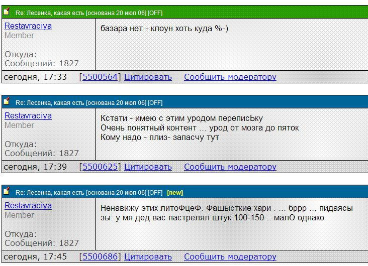 Garya 2 бухой бык. Я Вас не банил. Garya Но правила Вы нарушили - это видно по скриншоту, который Вы же сами привели. В теме топика имеется коверкание русской речи. 1) Топик не был бы закрыт, после непонятного бана (совокупность обстоятельств усилила эмоции) 2) Топик был бы закрыт после предупреждения (не говорю, что модератор обязан предупреждать, но мог бы) 3) Закрывались бы все топики противоречащие правилам (как пример раз, f1e0]два[/url]'>два... далее можно найти ещё сотни.) 3) В закрытом топике не было бы приписки "До переименования". Этот бред меня добил. Получается, что модератор говорит, что я нарушил правила дав топику такое название, и провоцирует на очередное нарушение - мол сообщите название на "лестнице", которая как известно запрещена. Garya Второй раз Вы наршили правила, высказавшись на ОНС с применением нецензурной лексики. Кроме того, когда люди (не воинствующие чайники, а достойный уважения за оказываемую в большом количестве помощь новичкам проффесионалы), говорят "не бери в голову. у них весенние обострения. ночная и гипер активность и т.п. симптомы. (а если серьезно к ним относиться - то на всех модеров скуль-ру ни духовых ружий, ни расстрельных комманд не напасёсси)", а также и также - стоит задуматься, что поведение в отношении некоторых модераторов как поведение воспитательницы в детском саду (ай детишки пошалили) уже не совсем уместное. Действительно нужно выступить в роли главврача. Или провести небольшую "партийную чистку" (это джуджу). PS: Последний раз меня забанили (подозреваю) за мат на упомянутой "лестнице", но это меня мало волнует - мат был адресован модератору, и а аксесе я больше никогда не покажусь. ... |