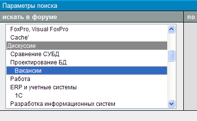 Если я вызываю поиск из подфорума Вакансии или Архив ПТ, то у меня кусор становится на Использование СУБД. Ни Вакансии, ни Архив ПТ в списке не наблюдаю. Проверялось на IE 7.0.5730.13 Opera 9.61 ... |