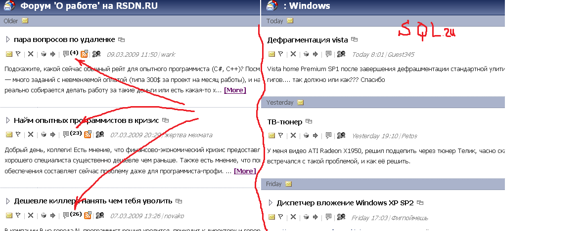 колонка "ответы" очень бы устроила но я не вижу её.. форум читаю через рсс- feeddemon2.7 там приходят первые сообщения веток.. если нужно ответы читать то открываешь ветку (иногда бывает там нет ответов оказывается) а если rss подправить? туда в шапку сажать эти цифры из колонки "ответы" ? точно.. мне же rss надо - форум и не надо трогать... ---- так же читаю rsdn.ru - там у них в заголовке указывается в скобках количесво ответов правда там свои неудобство есть - каждый ответ нужно открывать отдельно.. не так как у нас на sql.ru - ветку целиком (все ответы сразу) ... |