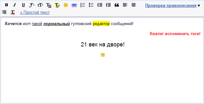 Яростный Меч Т.е. полноценный визуальный редактор, со всеми имеющимися возможностями (цитирование "пирамидкой", спойлеры и проч.)? ... |
