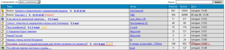там есть еще одна особенность - по крайней мере проверено для тему "А что на Украине изменилось" и те темы, когда это было несколько месяцев назад - количество ответов, которые можно видеть при чтении топика на 1 меньше, чем написано в стоблце "Ответов" на странице форума. ... |