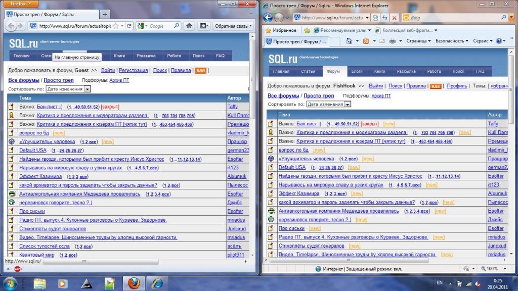 Гаджимурадов Рустам, У меня два компьютера на работе, с которыми я периодически работаю, то с одним то с другим. К тому же есть домашний и коммуникатор на андроиде, прослеживается четко - [new] к сообщениям прибавляется в зависимости от устройства или браузера, но не ника. Скажем если я не выходил на скуль с одной из машин неделю, а с другой выходил пять минут назад, то залогинившись с первой получаю список непрочитанных топиков за неделю. То же работает и на одной машине на разных браузерах. См. скриншот, Ф5 нажат в обоих окнах ... |