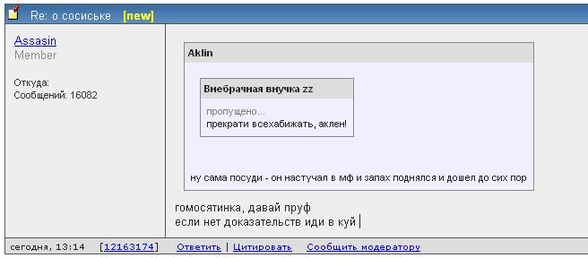 Assasin эту мышиную возню начал аклин и его дружок баскин это раз два - возню затеял ты под предлогом Код 1. 2. 3. 4. Код 1. Код 1. 2. 3. 4. 5. 6. 7. Assasin одна тема называлась "асасиське", другая "о сосиське" названия обеих тем со злым и оскорбительным умыслом искажают мой ник почему ты не рассмтривал такой вариант ? Assasin так же, в первой удаленной теме жертва моего оскорбления, еще до того как я грубо обозвал его представителем сексуального меньшинства, попросил своего друга передать мне, что он обо мне думает, при чем в очень грубой форме но ты ПЕРВЫЙ кто спалился на втором же сообщении Assasin к тому же, каким-то образом на форуме ПТ был опубликован скриншот с закрытого модераторского форума, что, я тоже считаю недопустимым это был не скриншот. самое забавное - что каждый из топиков прожил продолжительное время, дожидаясь, пока значительная часть пользователей успеет ознакомится с его содержимым. тем не менее, топики были удалены, наиболее вероятной причиной могу назвать срач в мф по причине обсуждения. ... |